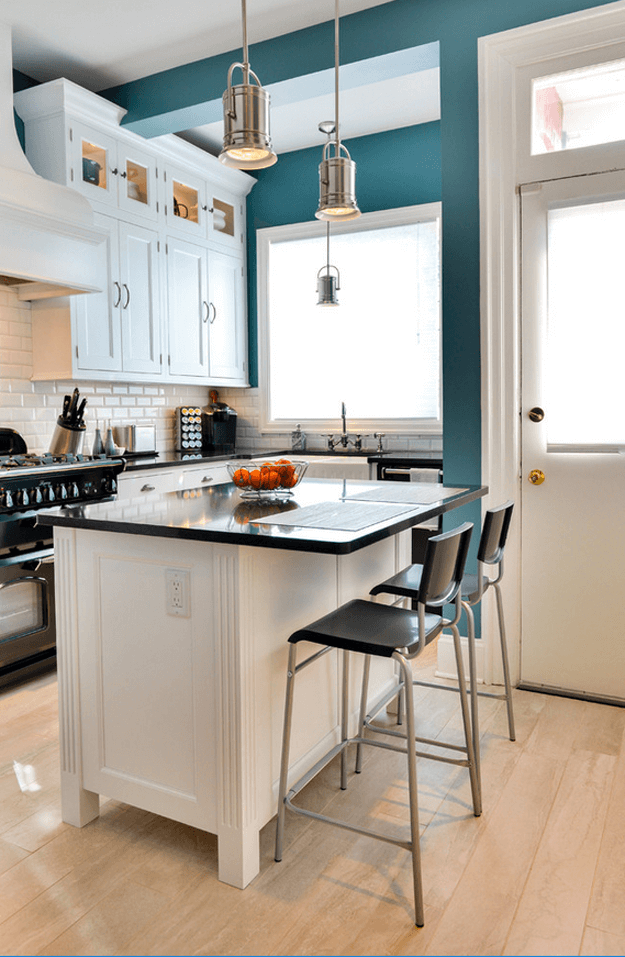 Here’s a space I could hang out in for hours. I love the contrast of the teal upholstered bar stools against the white tiled bar front. And, the gray reclaimed wood is pretty awesome too!