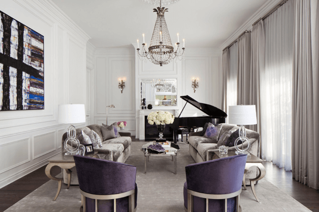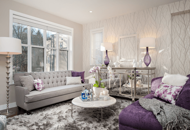 I love how this living room design has both a traditional and contemporary vibe all at the same time. The purple-gray sofas and throws add a sophisticated touch to the look.
