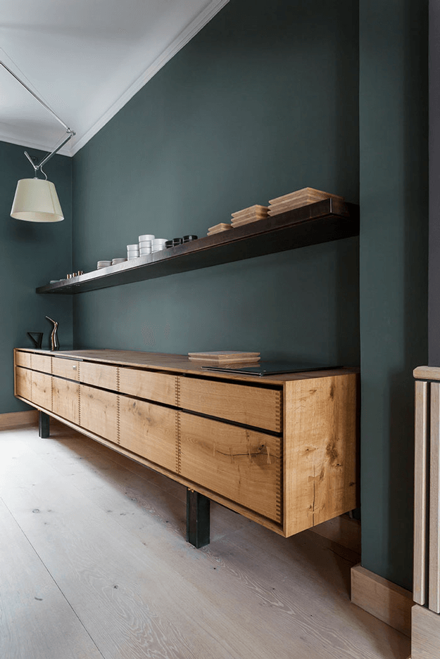 Taupe gray toned wood floors is a great way to introduce this color to your interior. It contrasts beautifully with dark navy blue walls…